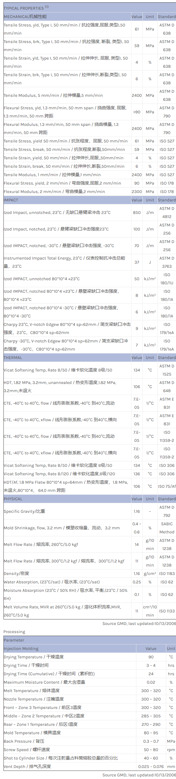 应用范围:产品描述CYCOLOY PC/ABS EFX810ME物性表Modified PC blend offering metallic / sparkle look with minimal flowline visibility.