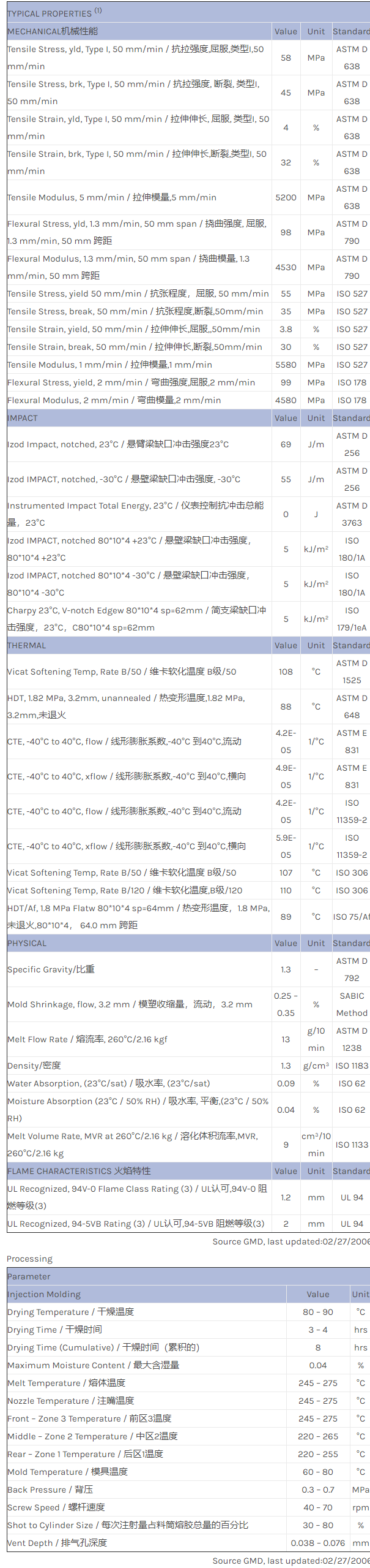 应用范围:产品描述CYCOLOY PC/ABS C7230P物性表Cycoloy* C7230P resin is a mineral filled, flame retardant PC/ABS. Good stiffness combined with balanced flow and IMPACT performance, makes it a good candidate for various