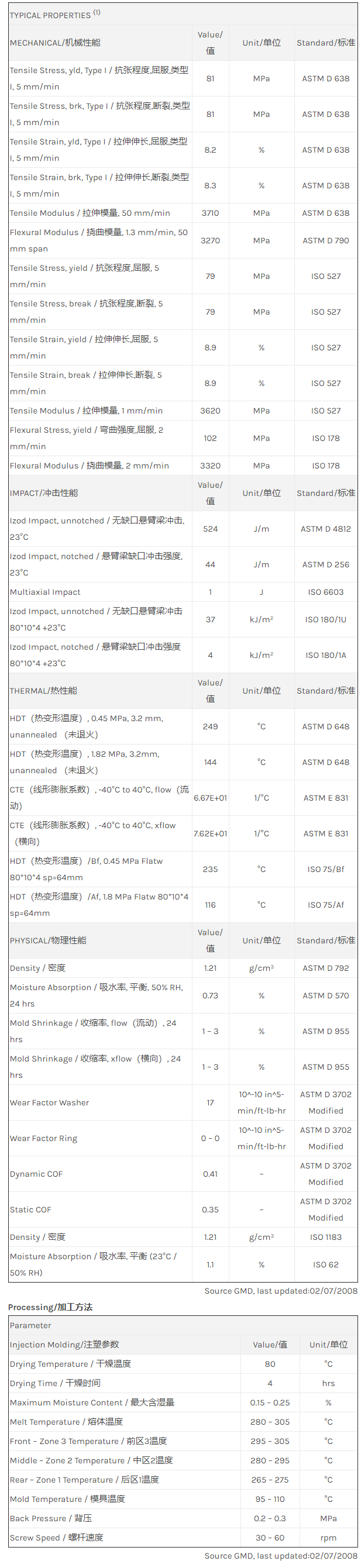应用范围: 产品描述 LNP Lubricomp RX05487物性表 “LNP LUBRICOMP RX05487是一种聚酰胺66(尼龙66)产品,含有的填充物为10%芳族聚酰胺纤维,可以通过注射成型进行加工。 特性包括: 抗翘曲 耐磨 润滑” PA 66, Aramid, PTFE, Low Warpage Property/特性