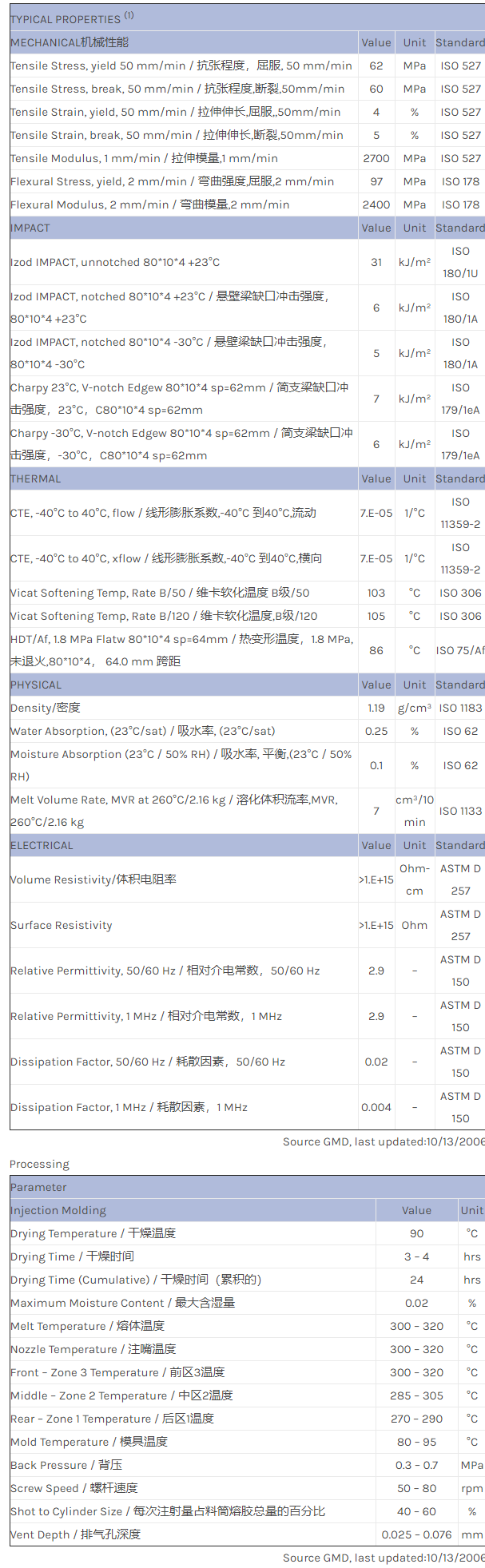 应用范围:产品描述CYCOLOY PC/ABS EFX830ME物性表Flame retardant modified PC blend using non-brominated and non-chlorinated flame retardant systems, offering metallic / sparkle look with minimal flow line visibility