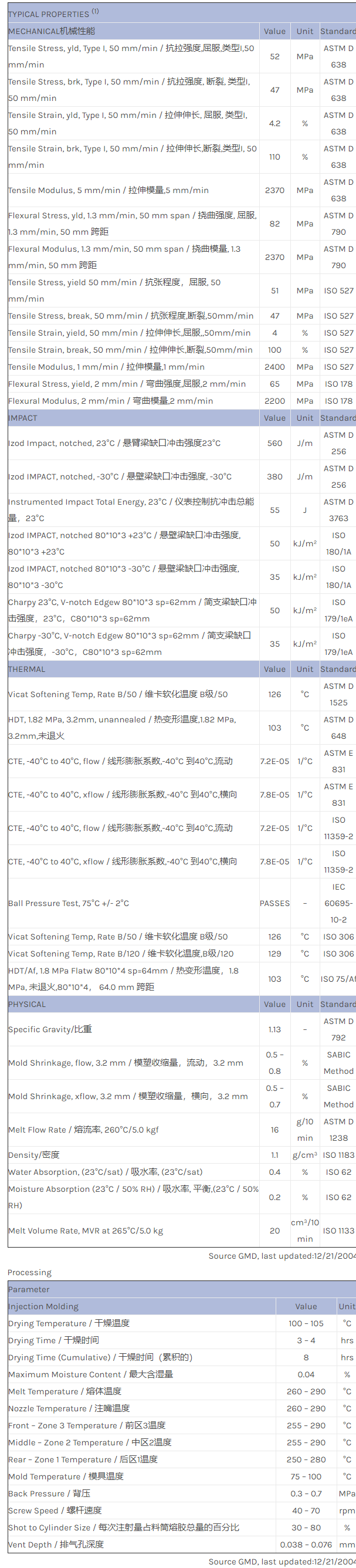 应用范围:产品描述CYCOLOY PC/ABS CP8930物性表High heat, PC/ABS for automotive electro plating applications, excellent balance in flow/IMPACT
