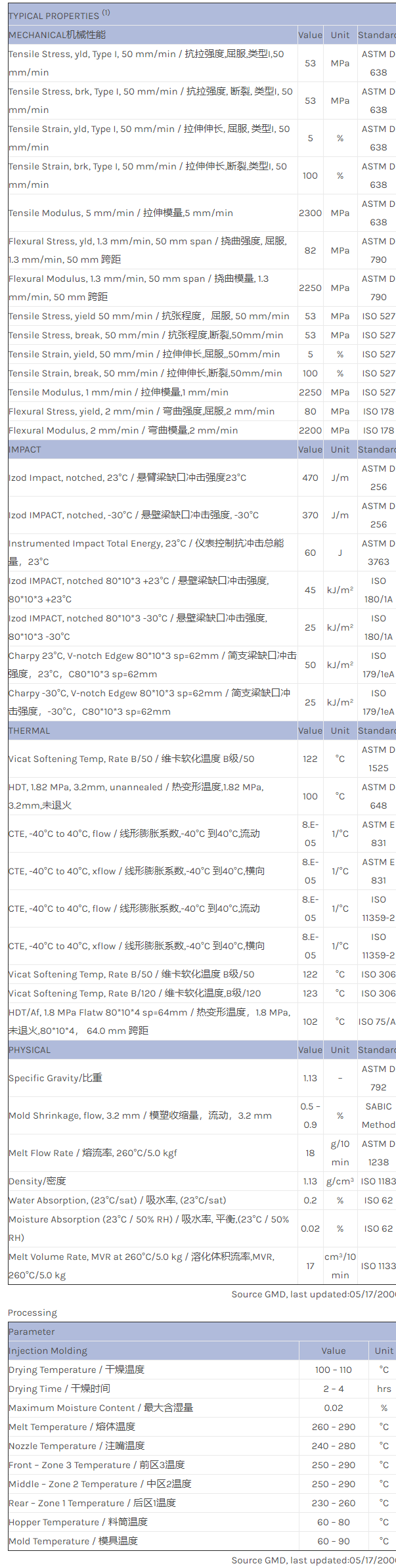 应用范围:产品描述CYCOLOY PC/ABS CY200FC物性表High flow PC+ABS material designed for local Pacific Automotive applications相关色号:CY200FC-16100、CY200FC-76701