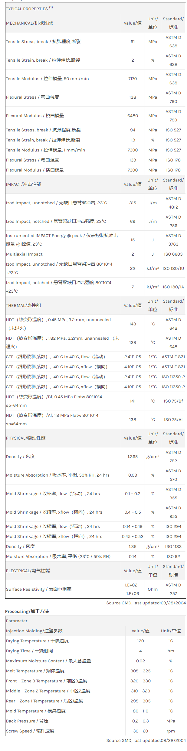 应用范围: 产品描述 LNP Lubricomp DCL329XZ物性表 “LNP LUBRICOMP DCL329XZ是一种聚碳酸酯(PC)产品,含有的填充物为碳纤维增强材料,可以通过注射成型进行加工。 特性包括: Flame Retardant 传导性 润滑” LNP LUBRICOMP* DCL329XZ is a compound based on Polycarbonate res