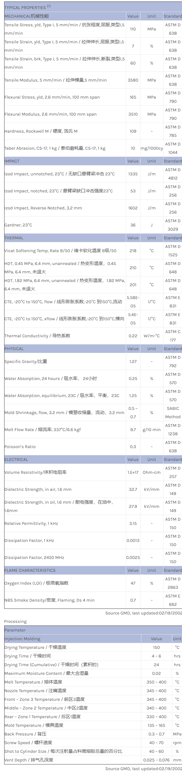 应用范围:产品描述ULTEM PEI 1000M物性表Standard flow Polyetherimide (Tg 217C) with internal mold release. ECO Conforming.