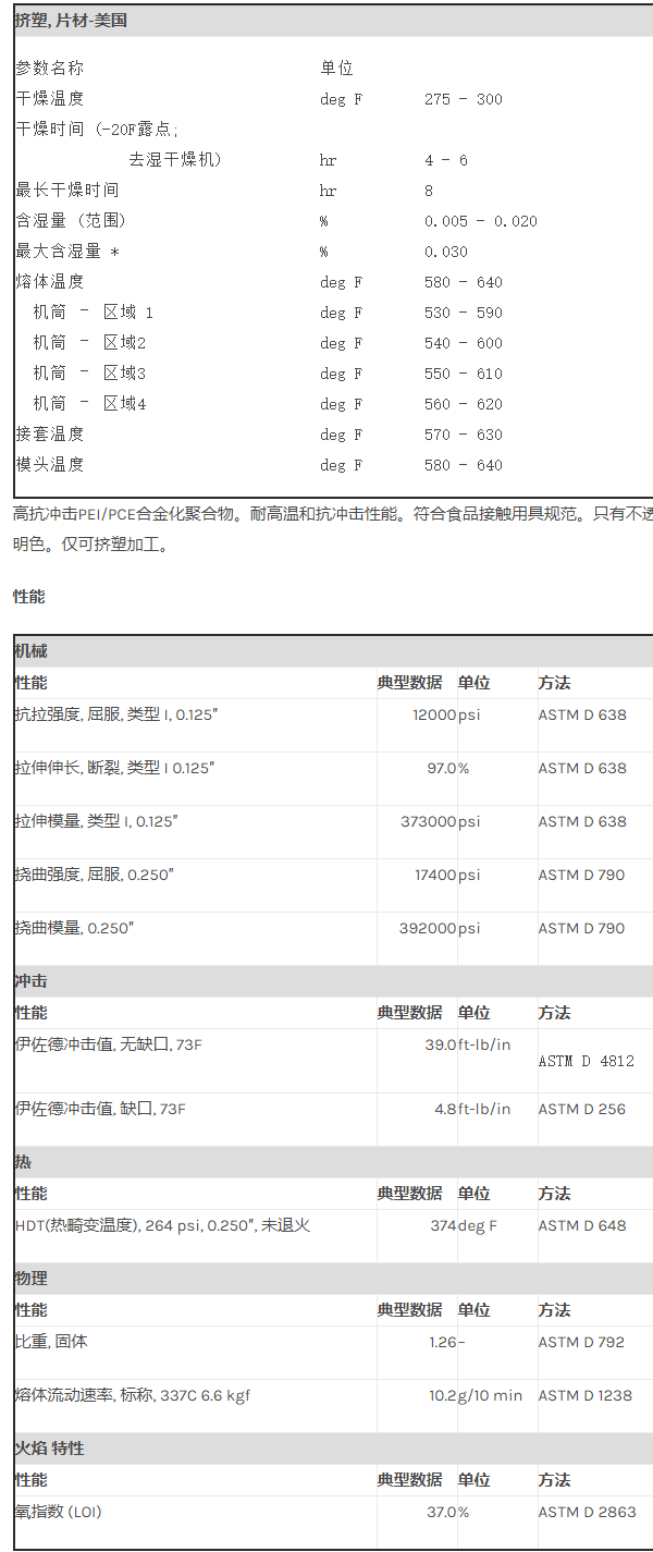 应用范围: 产品描述 Ultem PEI HTX2000F物性表 高抗冲击PEI/PCE合金化聚合物。耐高温和抗冲击性能。符合食品接触用具规范。只有不透明色。仅可挤塑加工。 加工