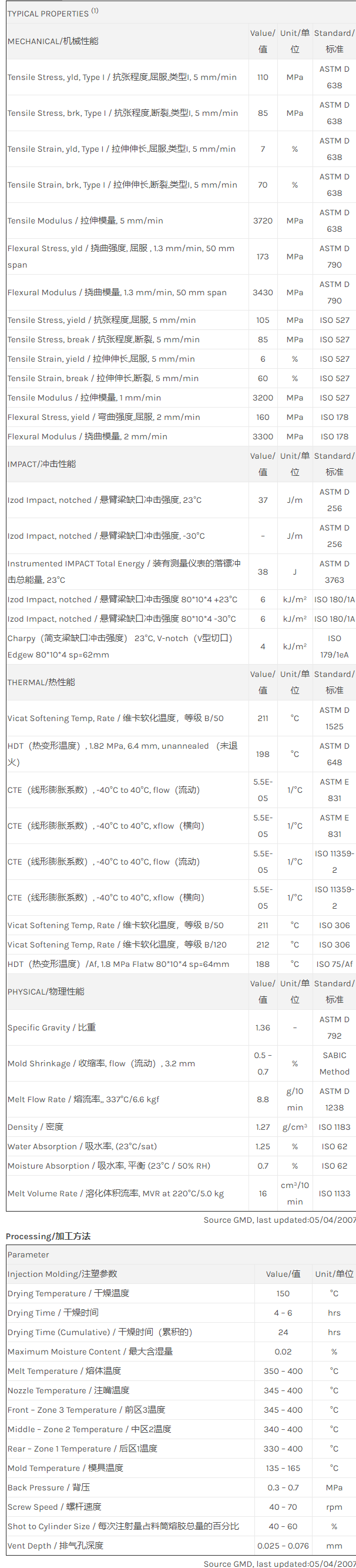 应用范围: 产品描述 ULTEM PEI HU1100物性表 “Ultem HU1100 resin是一种聚酯酰亚胺(PEI)产品,它可以通过注射成型进行加工。 典型应用领域为:医疗/保健。 特性包括: 具可灭菌性 环保/绿色 可接触食品 生物相容”。 相关颜色色号:HU1100-8H8D217 Standard/标准 flow Polyetherimide (Tg 217C). EC