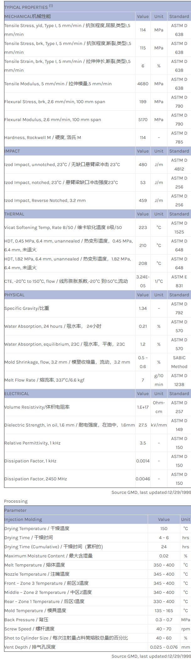 应用范围:产品描述ULTEM PEI 2100N物性表10% 玻纤增强,良好的刚度与尺寸稳定性。优异的可加工性。非UL列表。