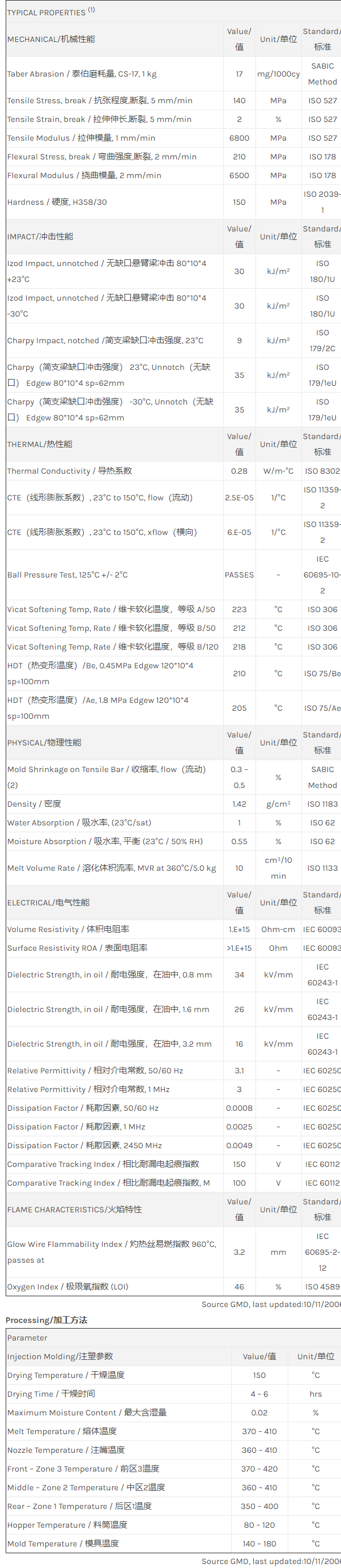 应用范围: 产品描述 ULTEM PEI 2210F物性表 “Ultem 2210F resin是一种聚酯酰亚胺(PEI)产品,含有的填充物为20% 玻璃纤维增强材料。 典型应用领域为:食品接触应用。 特性包括: 环保/绿色 可接触食品” 20% Glass fiber filled, enhanced flow Polyetherimide (Tg 217C). US FDA and Eu