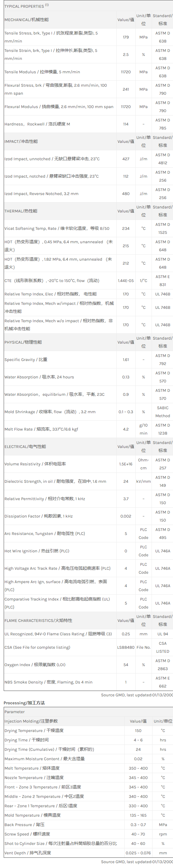 应用范围: 产品描述 ULTEM PEI 2400物性表 ULTEM 1000的40% 玻纤增强PEI树脂种类。非常高的劲度与尺寸稳定性。 相关颜色色号:2400-7301、2400-1000 40% Glass fiber filled, standard flow Polyetherimide (Tg 217C). ECO Conforming, UL94 V0 and 5VA listing