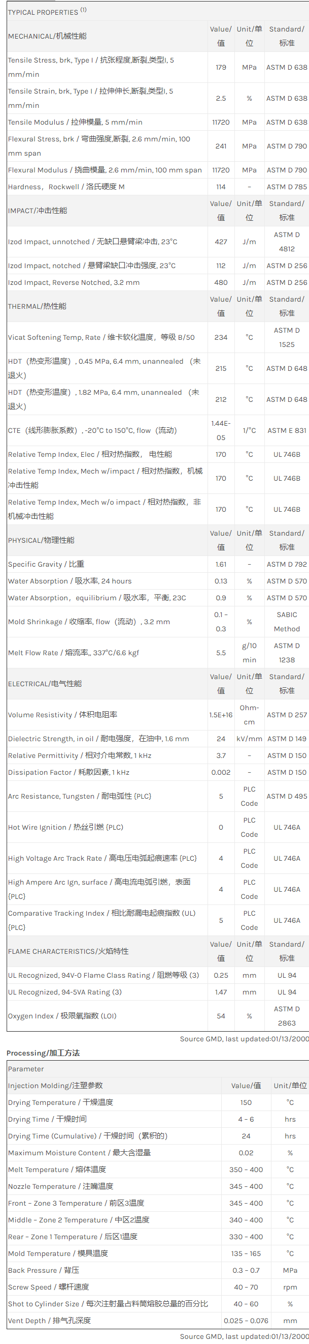 应用范围: 产品描述 ULTEM PEI 2410R物性表 40% 玻纤增强、低粘度PEI树脂,有脱模剂。 40% Glass fiber filled, enhanced flow Polyetherimide (Tg 217C) with internal mold release. ECO Conforming, UL94 V0 and 5VA listing. Property/特性