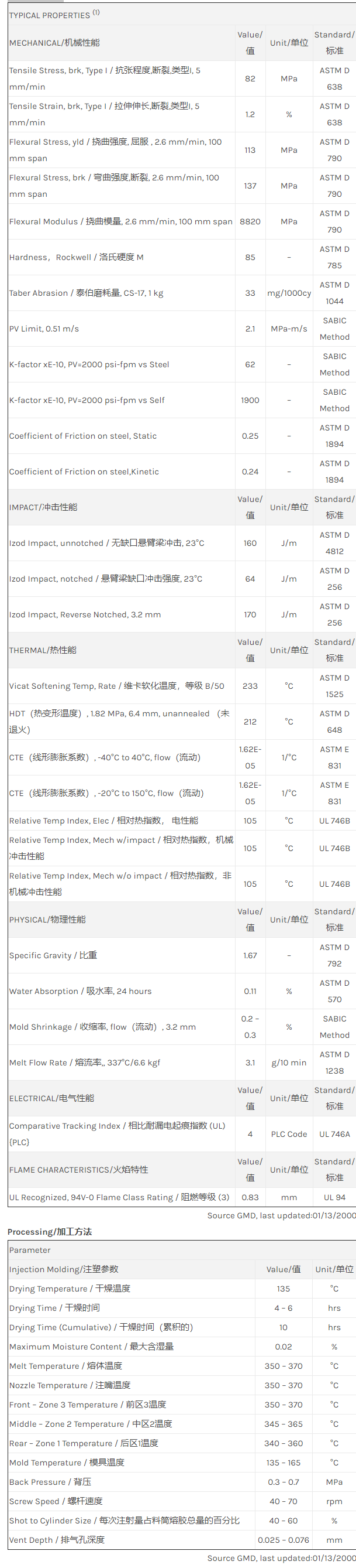 应用范围: 产品描述 ULTEM PEI 4000物性表 玻璃纤维增强型PEI树脂承载牌号,增强的耐磨性及减少的摩擦系数。 相关颜色色号:4000-7401 Glass fiber, PTFE, and Graphite filled, standard flow Polyetherimide (Tg 217C). ECO Conforming, UL94 V0 listing. Propert