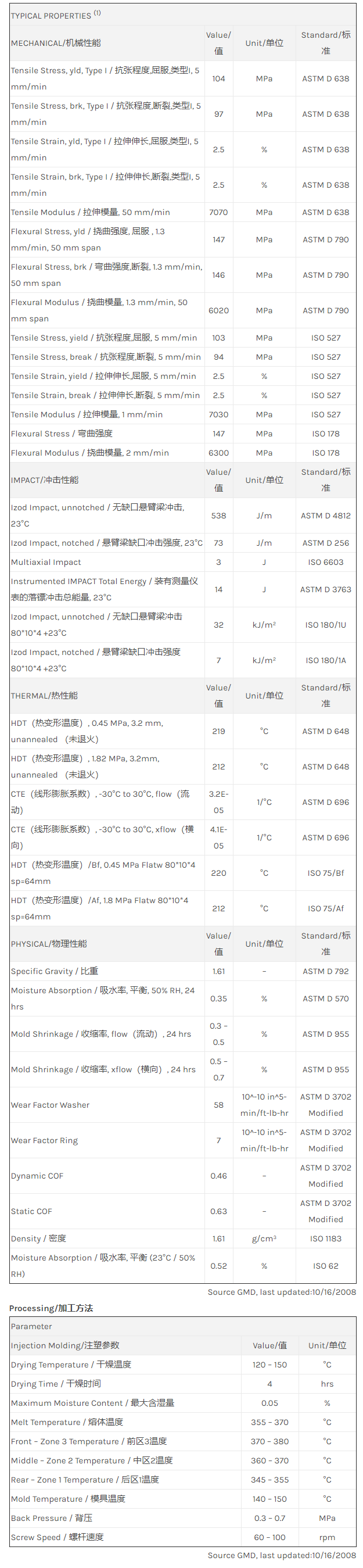 应用范围: 产品描述 LNP Lubricomp JFL34物性表 “LNP LUBRICOMP JFL34是一种聚醚砜(PES)产品,含有的填充物为20%玻璃纤维增强材料,可以通过注射成型进行加工。 特性包括: 耐磨 润滑” LNP* JFL34 is a Polyethersulfone base resin containing glass fiber and PTFE. Charact