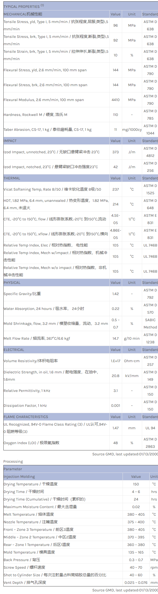 应用范围:产品描述ULTEM PEI 6202物性表12% Silica filled, standard flow Polyetherimide Copolymer (Tg 235C). ECO Conforming, UL94 VO Listing.