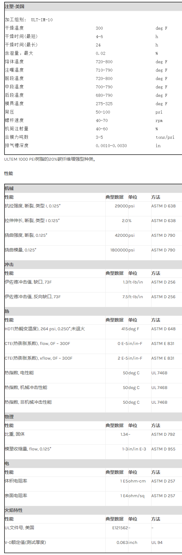 应用范围: 产品描述 Ultem PEI 7201物性表 ULTEM 1000 PEI树脂的20%碳纤维增强型种类。 加工