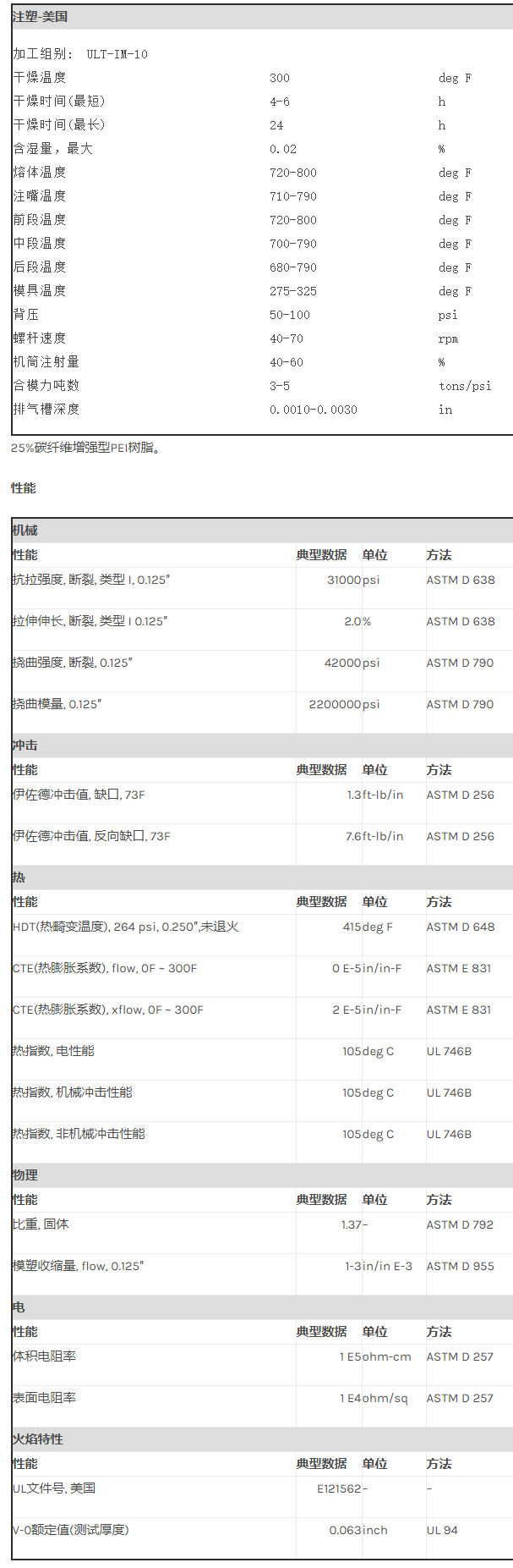 应用范围: 产品描述 Ultem PEI 7801物性表 25%碳纤维增强型PEI树脂。 加工