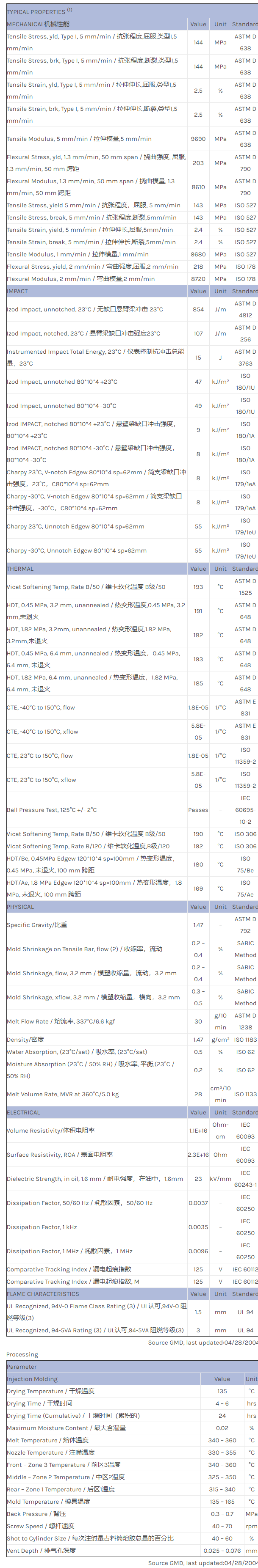 应用范围:产品描述ULTEM PEI ATX153R物性表30% Glass fiber filled, high flow Polyetherimide blend with internal mold release. ECO Conforming, UL94 V0 and 5VA listing.