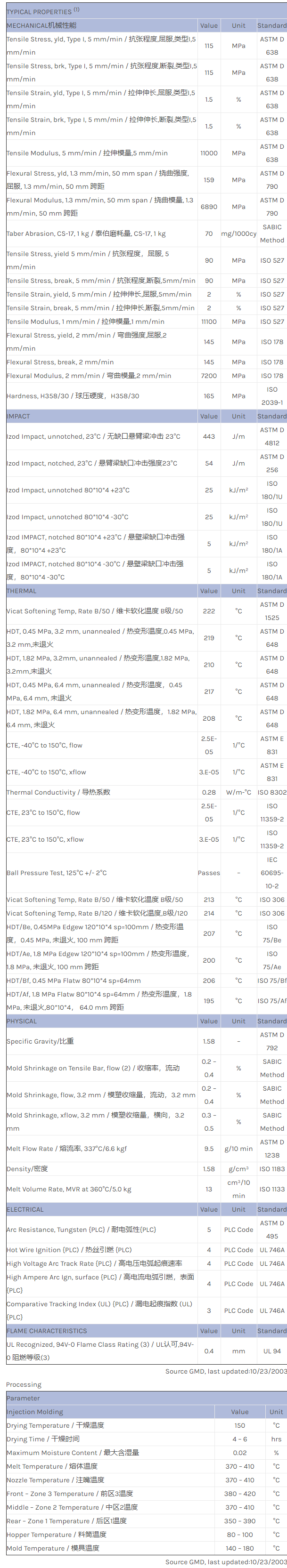 应用范围:产品描述ULTEM PEI EXUM0026物性表40% milled glass filled, high flow Polyetherimide (Tg 217C) with internal mold release and enhanced electroplatability. ECO Conforming, UL94 V0 listing.