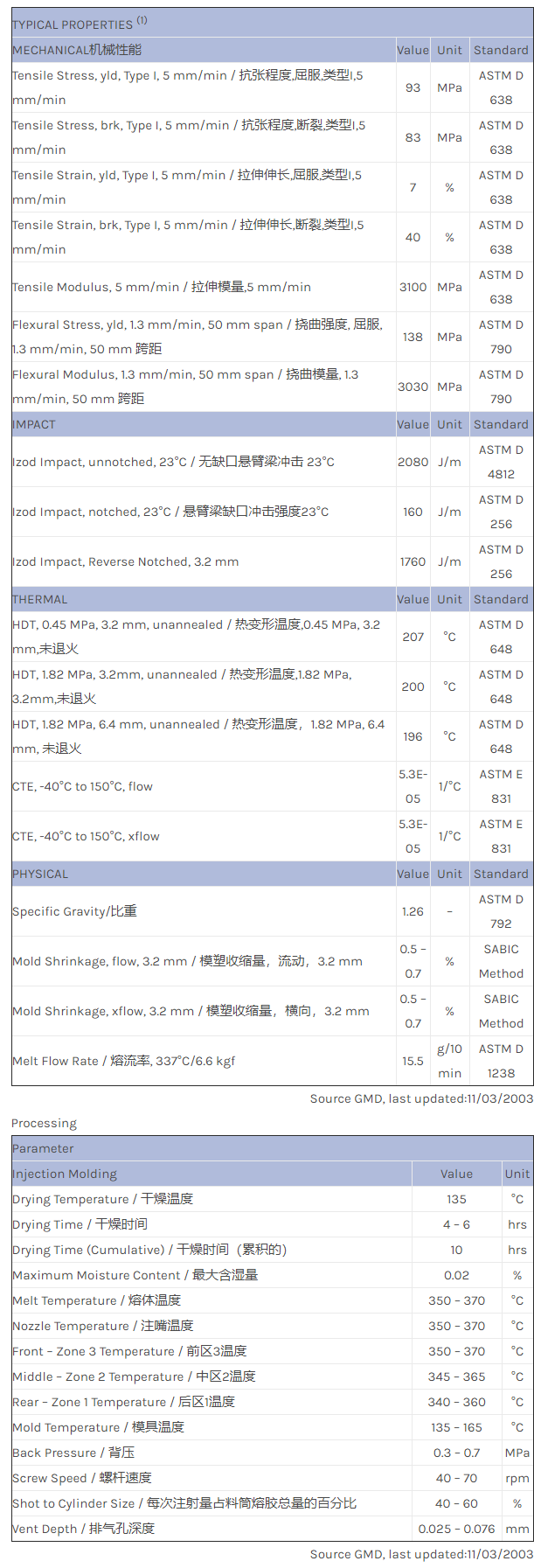 应用范围:产品描述ULTEM PEI EXUM0080物性表Higher impact, high flow Polyetherimide blend. ECO Conforming.