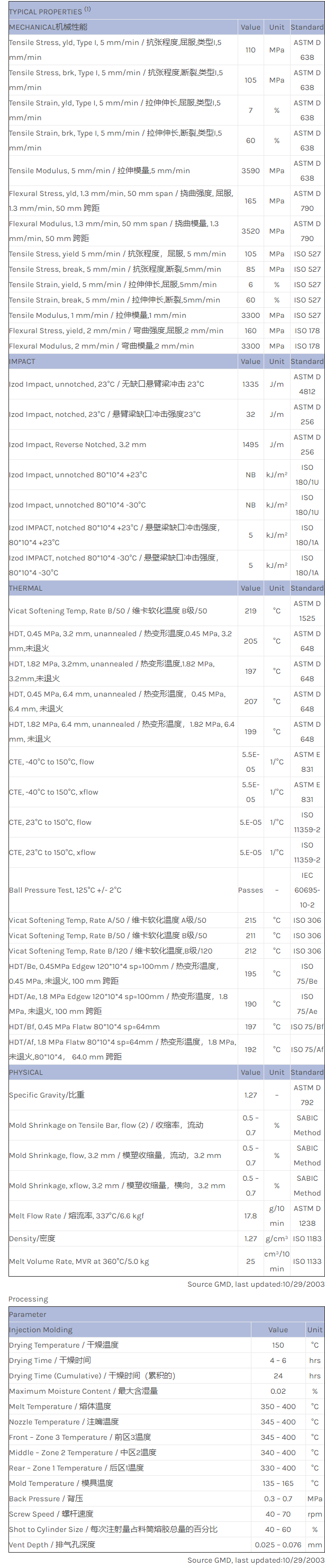应用范围:产品描述ULTEM PEI EXUM0081物性表Enhanced flow Polyetherimide (Tg 217C) with internal mold release. ECO Conforming.