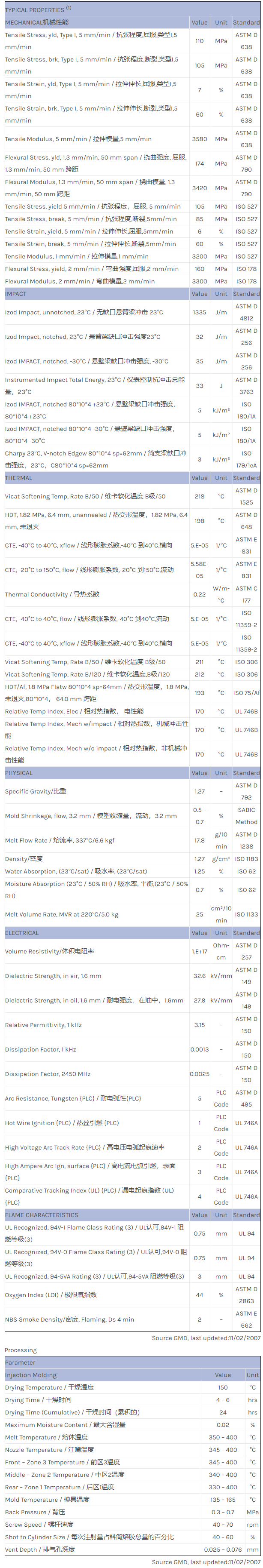 应用范围:产品描述ULTEM PEI 1010RV物性表Enhanced flow Polyetherimide (Tg 217C) with internal mold release. ECO Conforming, UL94 V0 and 5VA listing; color dependant, see UL Yellow Card.