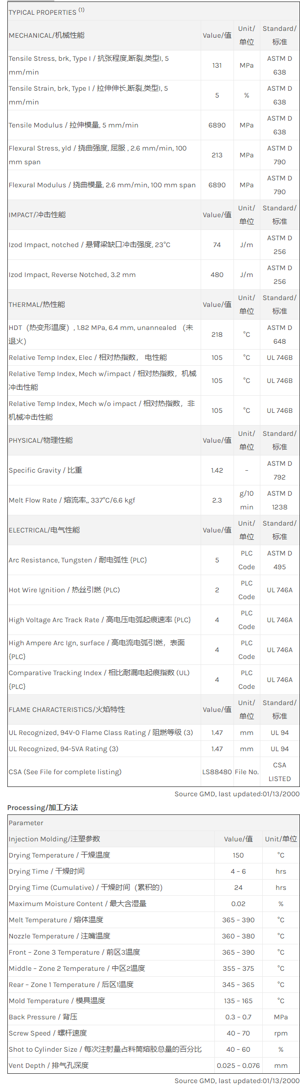 应用范围: 产品描述 ULTEM PEI CRS5201物性表 20% 玻纤增强共聚物。改良的耐化学剂性,耐强酸、碱、芳香族环烃、甲酮。 20% Glass fiber filled, standard flow Polyetherimide copolymer (Tg 225C) with enhanced chemical resistance to strong acids, bases, a