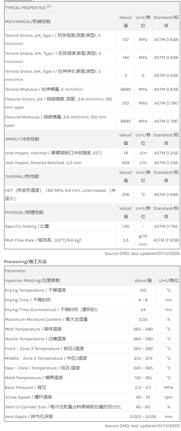 应用范围: 产品描述 ULTEM PEI CRS5211R物性表 20% 玻纤增强、低粘度共聚物。改良的耐化学剂性,耐强酸、碱、芳香族环烃、甲酮。内含脱模剂。 20% Glass fiber filled, enhanced flow Polyetherimide copolymer (Tg 225C) with internal mold release and enhanced chemical