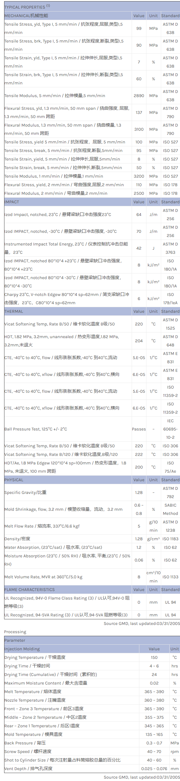 应用范围:产品描述ULTEM PEI UR5000B物性表Transparent, standard flow, flame retarded Polyetherimide (Tg 225C) with enhanced chemical resistance and reduced plate out. Restricted sales to GE Specialty Film & Sheet.
