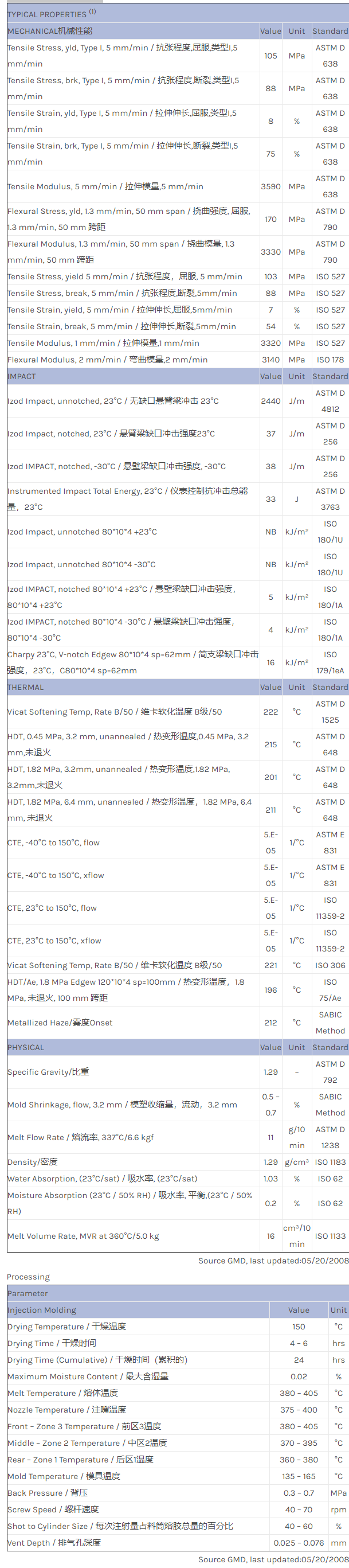 应用范围:产品描述ULTEM PEI AUT210物性表Ultem AUT210 resin是一种聚酯酰亚胺(PEI)产品,可以通过注射成型进行加工。典型应用领域为:汽车行业