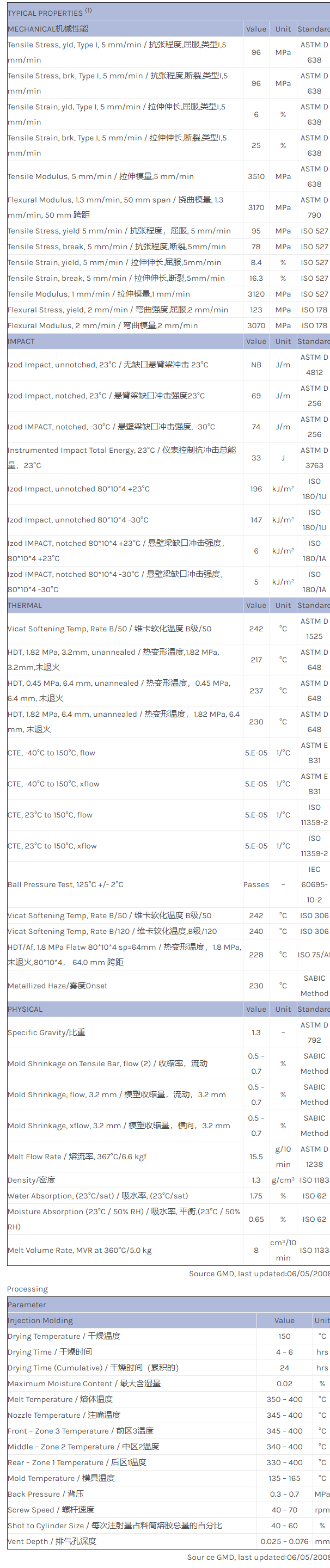 应用范围:产品描述ULTEM PEI AUT230M物性表Transparent polyetherimide (Tg 247 degC). Contains low level of mold release. Very low outgassing and plateout, for automotive lighting applications where highly metallized, re