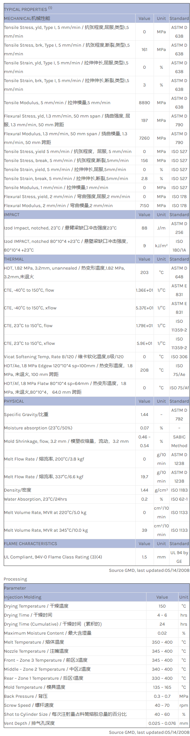 应用范围:产品描述ULTEM PEI EXUM0241物性表High flow Ultem for BiTS application