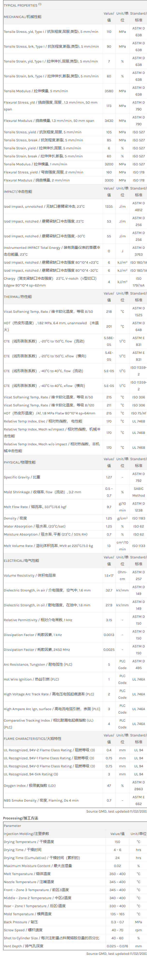 Standard/标准 flow Polyetherimide (Tg 217C) with internal mold release. ECO Conforming, UL94 V0 and 5VA listing; color dependant, see UL Yellow Card.
