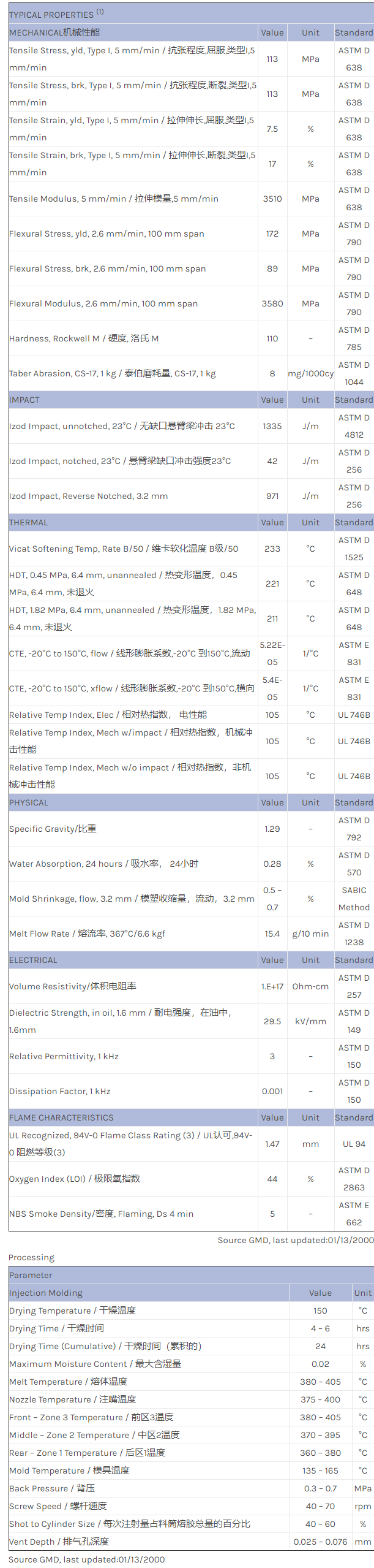 应用范围:产品描述ULTEM PEI 6000物性表Transparent, standard flow Polyetherimide copolymer (Tg 235C). ECO Conforming, UL94 V0 listing.