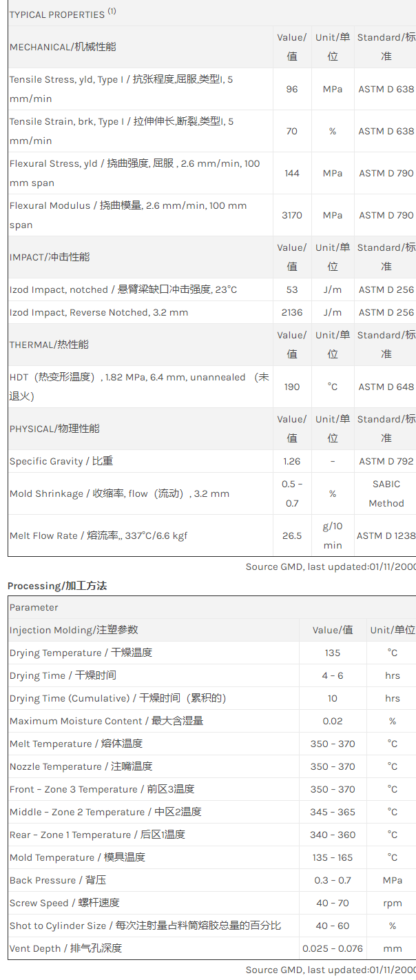 未增强型 PEI/PCE共混物。耐高温。仅有不透明色。内含脱模剂。