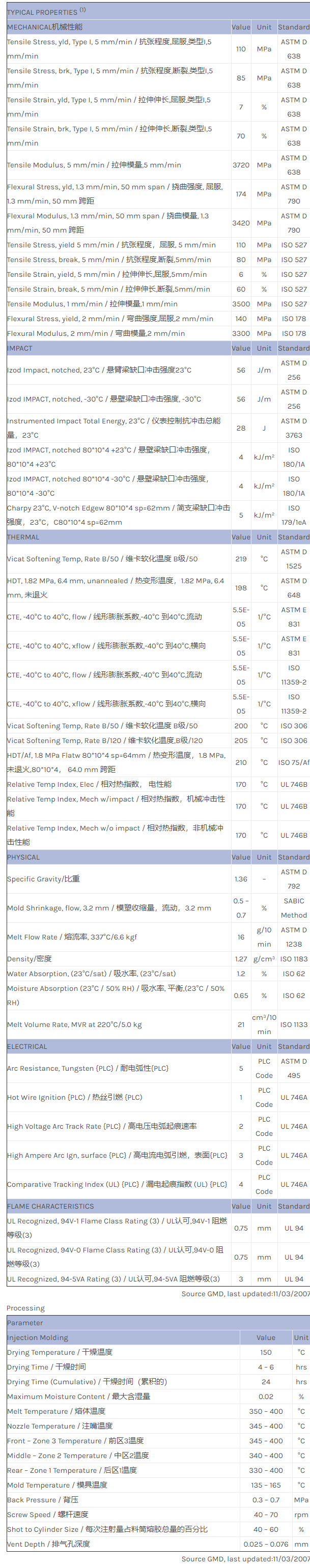 应用范围:产品描述ULTEM PEI 1110FV物性表Enhanced flow Polyetherimide (Tg 217C). ECO Conforming, UL94 V0 and 5VA; color dependant, see UL Yellow Card. US FDA and EU Food Contact compliant, NSF 51 listing.