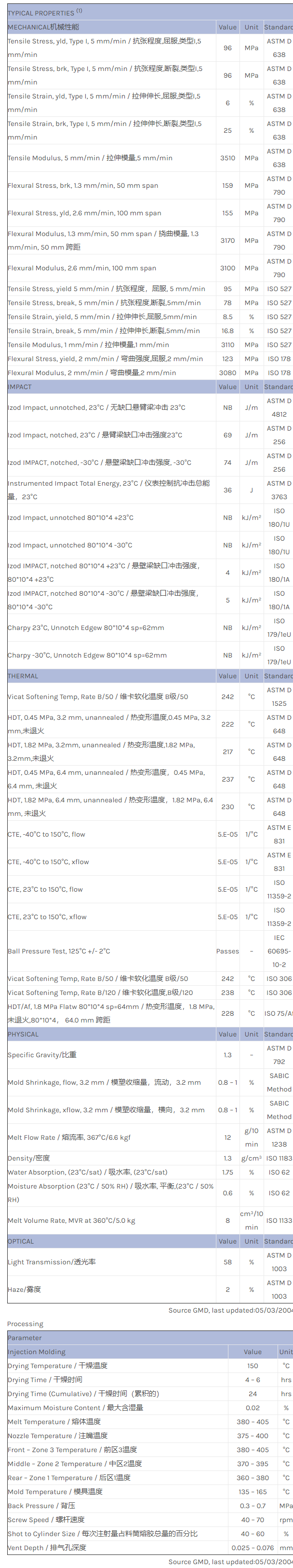 应用范围:产品描述ULTEM PEI EXUM0091物性表Transparent, enhanced flow Polyetherimidesulfone copolymer (Tg 247C) with internal mold release. ECO Conforming. Resin is subject to U.S. Commerce Control Laws (15CFR Chapter