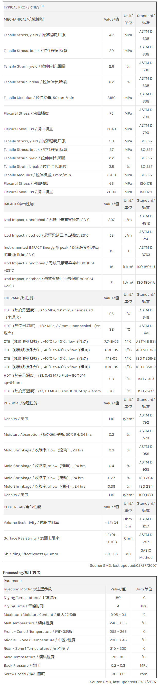 应用范围: 产品描述 LNP faradex AS003物性表 “LNP FARADEX AS003是一种丙烯腈丁二烯苯乙烯(ABS)产品,含有的填充物为15%不锈钢纤维,可以通过注射成型进行加工。 主要特点: 传导性 电磁屏蔽(EMI) 射频屏蔽 (RFI)” LNP* Faradex* AS003 is a compound based on Acrylonitrile Butadien