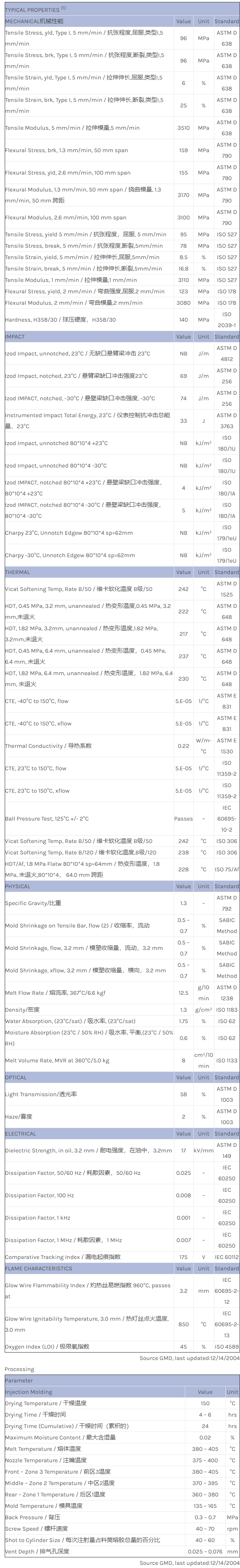 应用范围:产品描述ULTEM PEI XH6050F物性表Transparent, enhanced flow Polyetherimidesulfone copolymer (Tg 247C). ECO Conforming. US FDA Compliant. Resin is subject to U.S. Commerce Control Laws (15CFR Chapter VII, Part