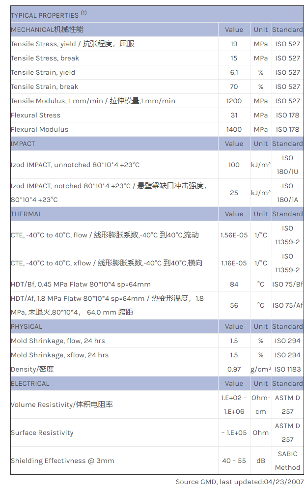 应用范围:产品描述LNP FARADEX MS002P物性表LNP* Faradex* MS002P is a compound based on Polypropylene resin containing Stainless Steel. Added features of this material include: Electrically Conductive, EMI/RFI Shielding