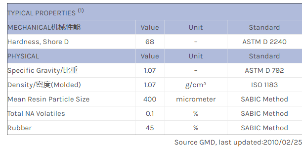 应用范围:产品描述Geloy ASA INP270物性表SABIC INP270 is a 45% polybutyl acrylate small (110 nm) rubber grafted extra-weatherable ASA modifier resin.Provides excellent IMPACT, heat distortion and weatherability propert