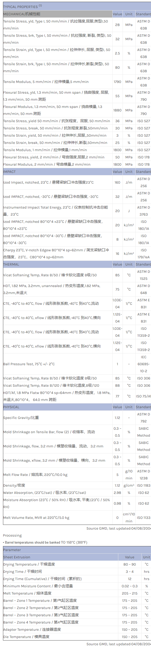 应用范围:产品描述Geloy ASA XTWE230物性表Extremely weatherable, lowest gloss extrusion grade ASA copolymer designed for profile and sheet capstock applications.