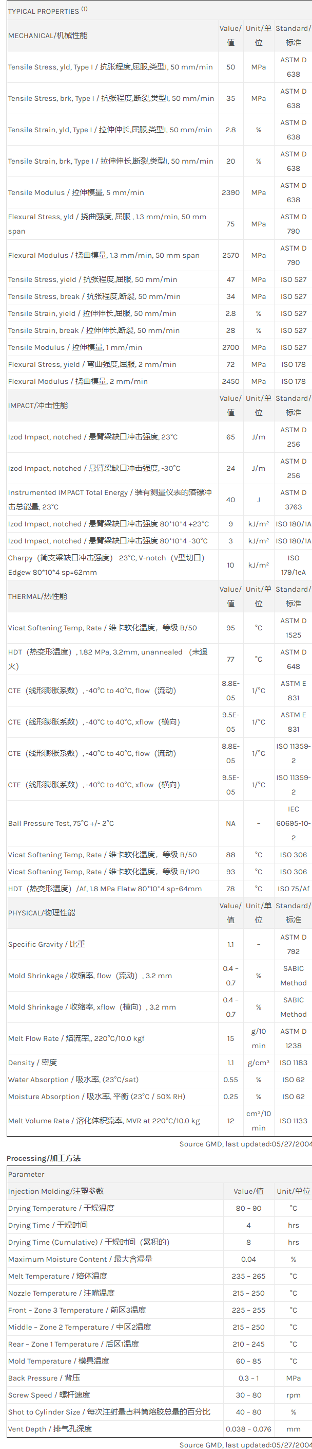 应用范围: 产品描述 Geloy ASA XTWM200物性表 相关颜色色号:XTWM200-GY8E106、XTWM200-GY7G286 ASA resin for injection molding. Excellent flow, low heat, colorability and outdoor weathering capability. Property/特性