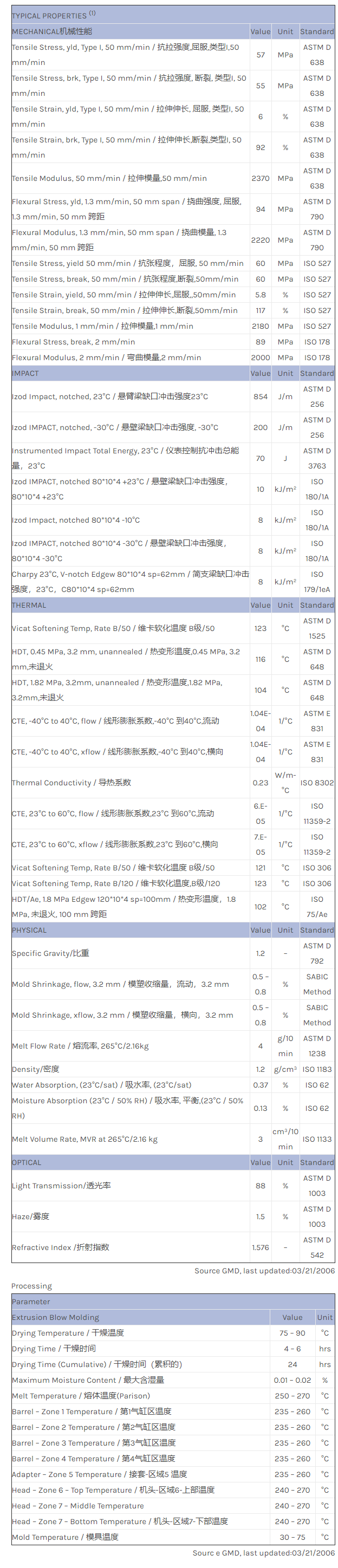 应用范围:产品描述XYLEX PC/PET X8409AC物性表PC + Polyester, Injection (Blow) Molding, or Extrusion Blow molding grade, Chemical Resistance and Transparency