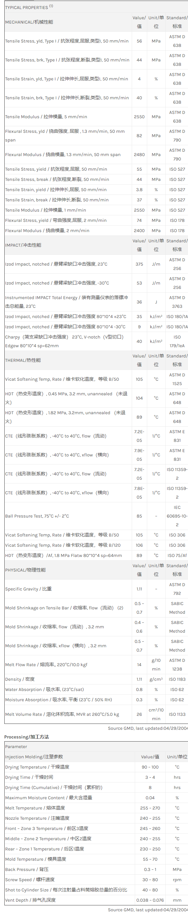 应用范围: 产品描述 Geloy ASA P7550物性表 “GELOY XP7550是一种丙烯腈-苯乙烯-丙烯酸酯+PC(ASA+PC)产品,可以通过注射成型进行加工。 典型应用领域为:户外应用。 特性包括: 良好的韧性 耐候性好 耐热” Injection molding grade ASA suitable for exterior applications featuring ou