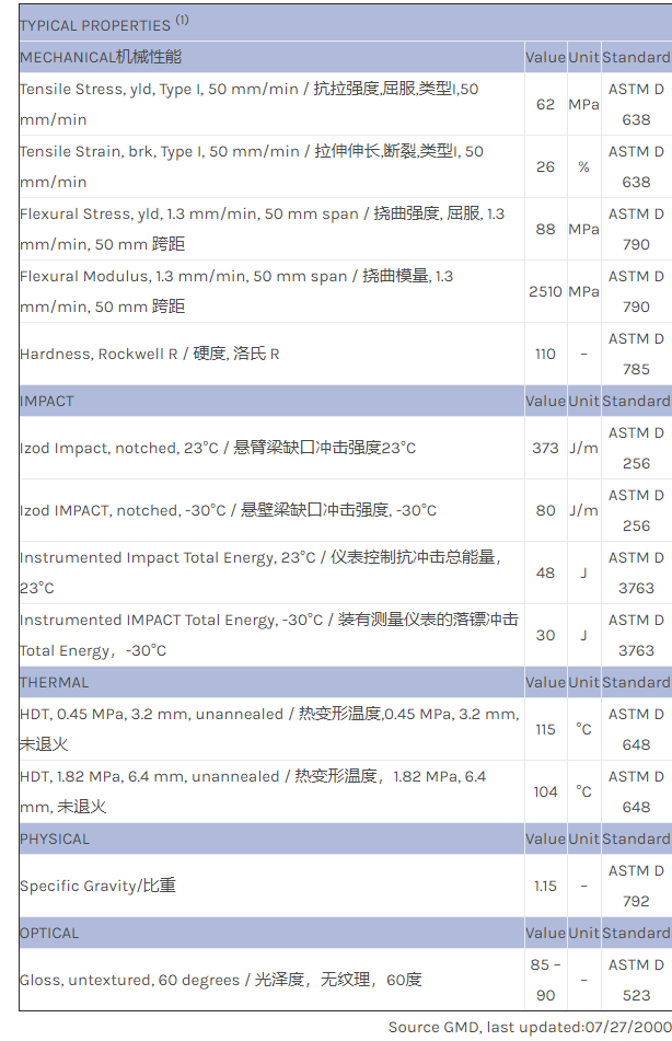 应用范围:产品描述Geloy ASA XP7015物性表ASA+PC for extrusion market. Recommended for sheet and capstock applications requiring high heat or high ductility. Check color availability.