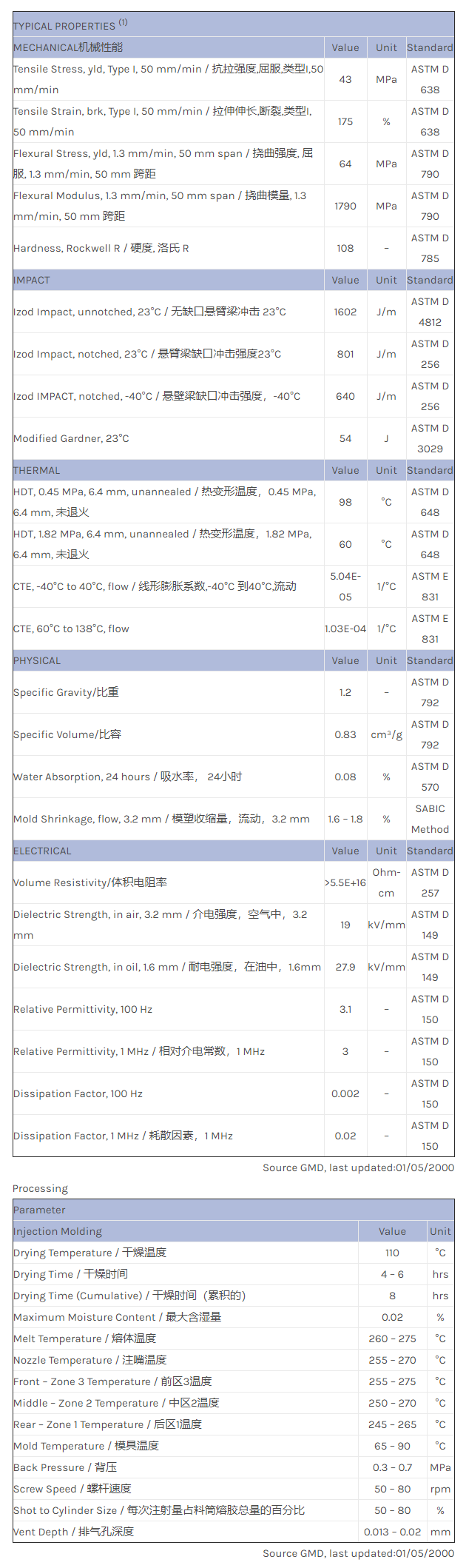 应用范围:产品描述XENOY PC/PBT/PET 1200物性表1200是一款未增强、不透明聚碳酸酯/聚酯共混物。主要特点:优异的耐化学剂性和低温抗冲击性。