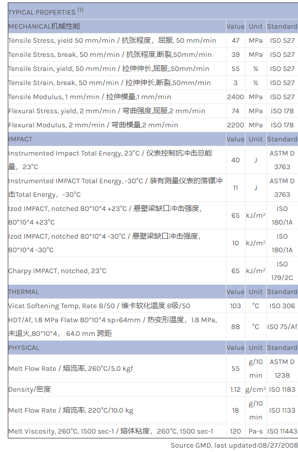 应用范围:产品描述Geloy ASA EXGY0056物性表High flow with improved IMPACT at room and low temperatures. Excellent weatherability for outdoor unpainted or clearcoated applications. Injection Moldable with large color ga