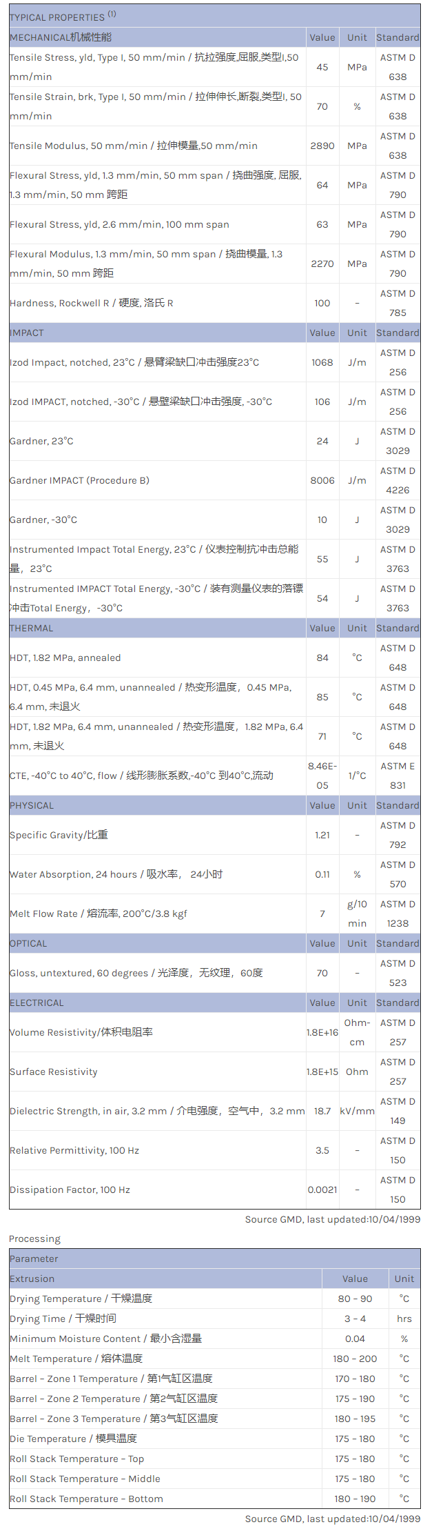 应用范围:产品描述Geloy ASA GY2030物性表ASA/PVC pellets for capstock profile extrusion. Suitable for outdoor unpainted applications. Available in dark colors only.