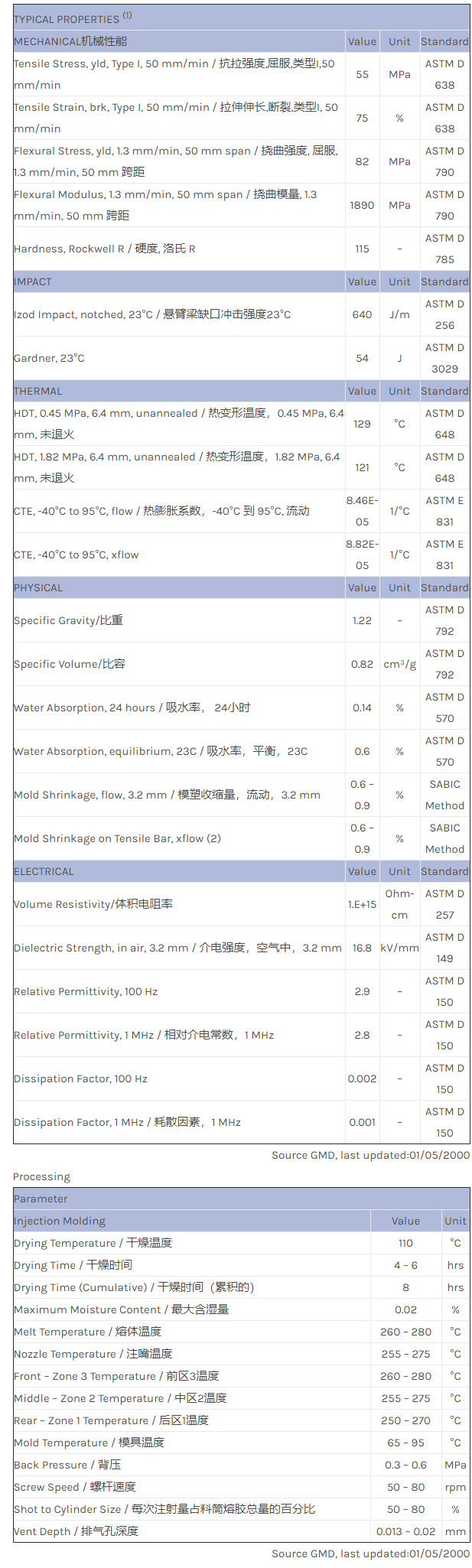 应用范围:产品描述XENOY PC/PBT/PET 2235物性表2235是一款未增强型、不透明PC/PET合金化聚合物。主要特点:耐化学剂尺寸稳定有一定的机械性能2235是2230的易流动牌号。
