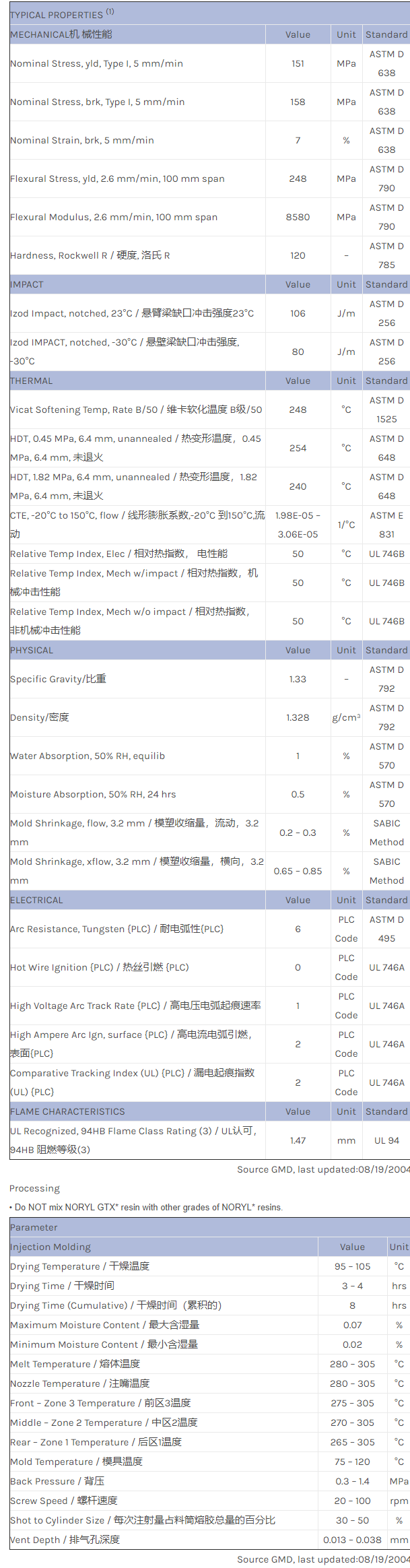 应用范围:产品描述NORYL GTX GTX830物性表GR 30%. Highest stiffness of 1200000 psi (8200 MPa) flexural modulus. Excellent chemical and high heat resistance. Application: under the bonnet.