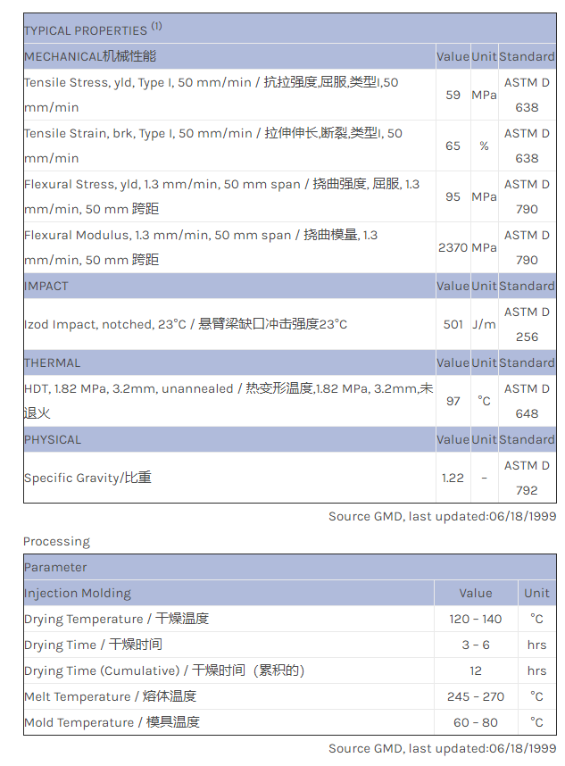 应用范围:产品描述XENOY PC/PBT/PET 9026物性表Utility grade polyester/polycarbonate alloy. Due to the nature of this material, drying temperatures and time may very between 120-140C and 3-6 hours.
